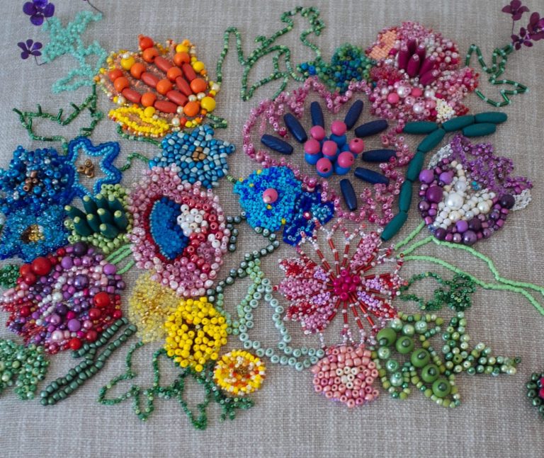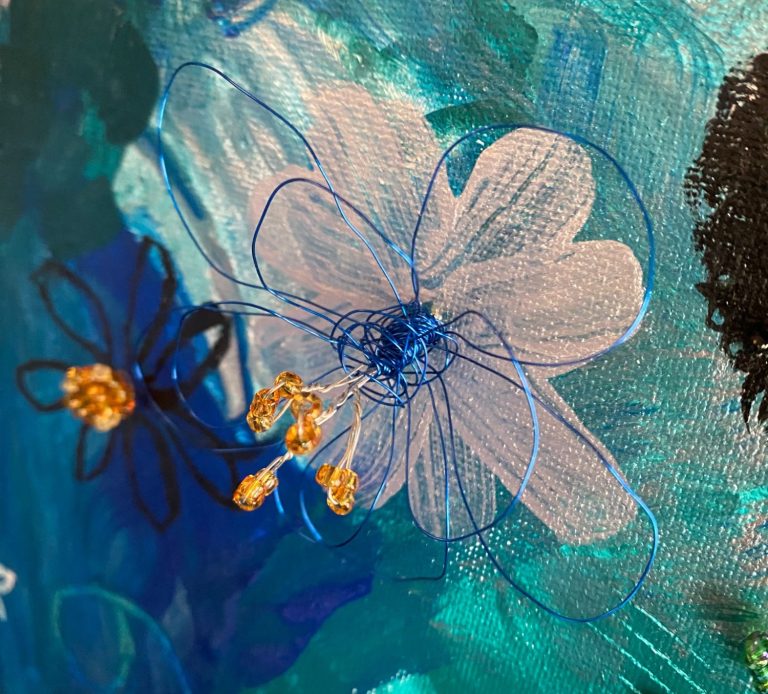 Min konst sträcker sig från tavlor i akryl med pärlbroderi och blommor i metalltråd till fristående skulpturer i trådslöjd och smycken, alla designade med noggrann detalj och kärlek.