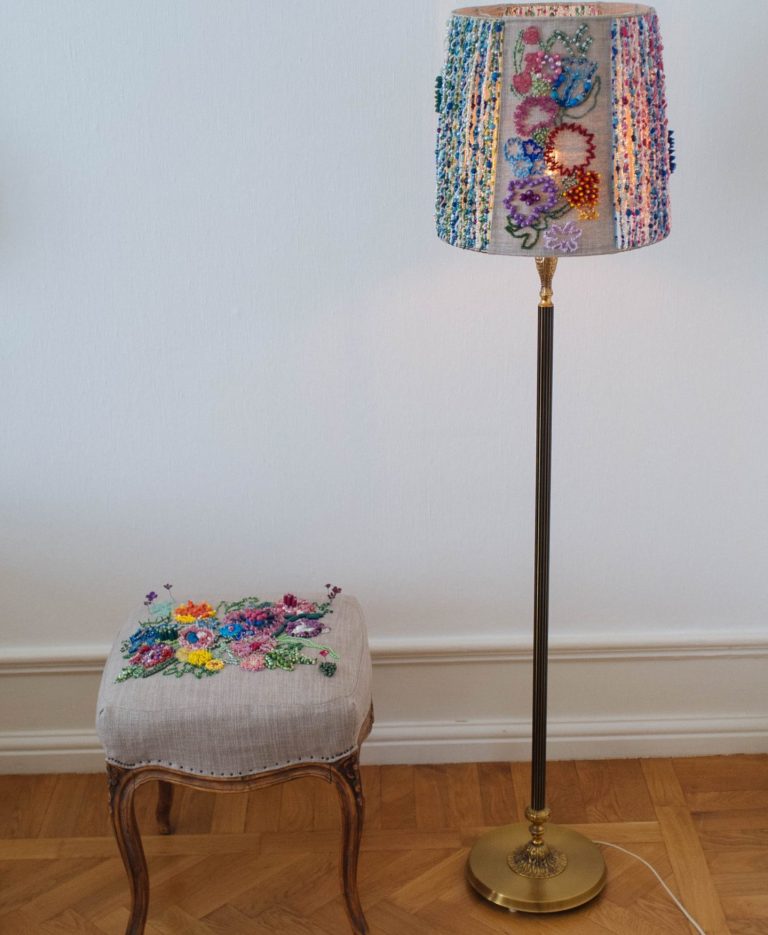 Under mitt sista år av utbildningen strävade jag efter att undersöka effekterna av att applicera pärlbroderi på begagnade bruksföremål. Detta involverade en pall samt en lampa.